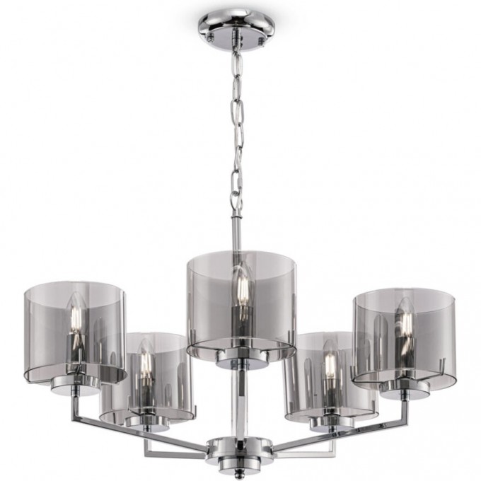 Серия Karen из хромированного метала и стекла выполнена в стиле минимализм. Стеклянные дымчатые плафоны дополнены гальваническим напылением, которое придает стеклу зеркальный эффект при выключенном освещении и делает его ярким и сияющим при включенном режиме. Плафоны имеют форму цилиндра и не закрыты сверху и снизу, что позволяет избежать скопления пыли. Плафоны крепятся на скобы, что позволяет быстро и легко их снимать и одевать. Высота люстры регулируется длиной цепи.